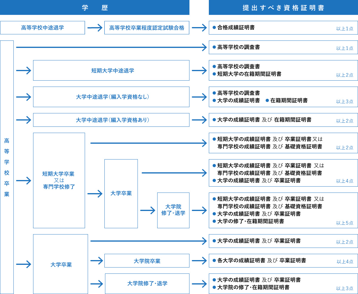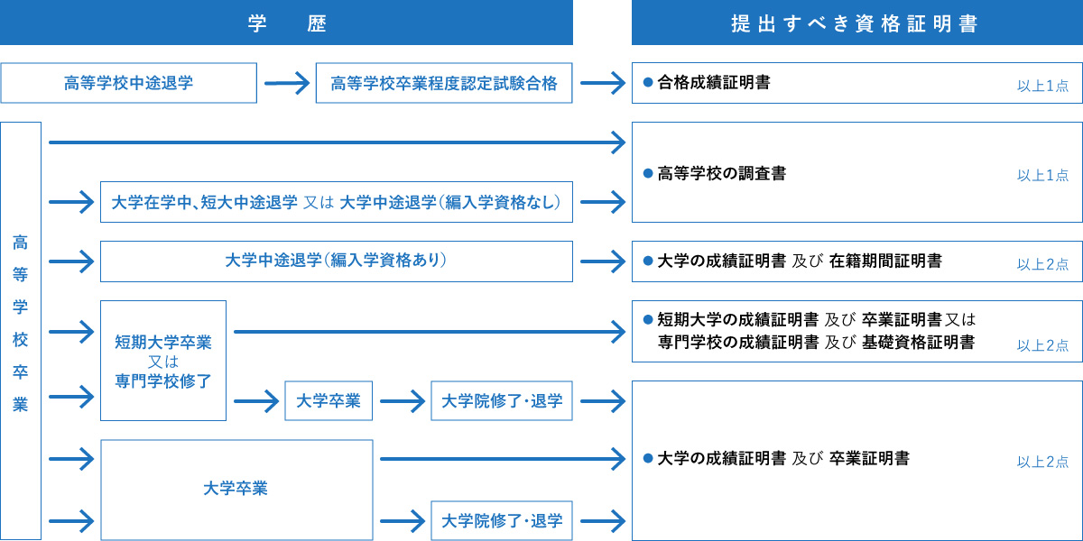 | ⑤出願資格の証明書 | 出身の学校等より請求してください。なお,発行日から1年以内のものに限ります。 詳細はこちらをご確認ください。 |
