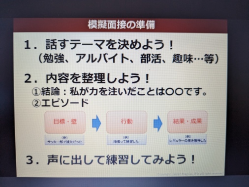 また,模擬面接では態度・姿勢・ZOOMでは目線など面接官が見るポイントを,模擬面接を体験しながら