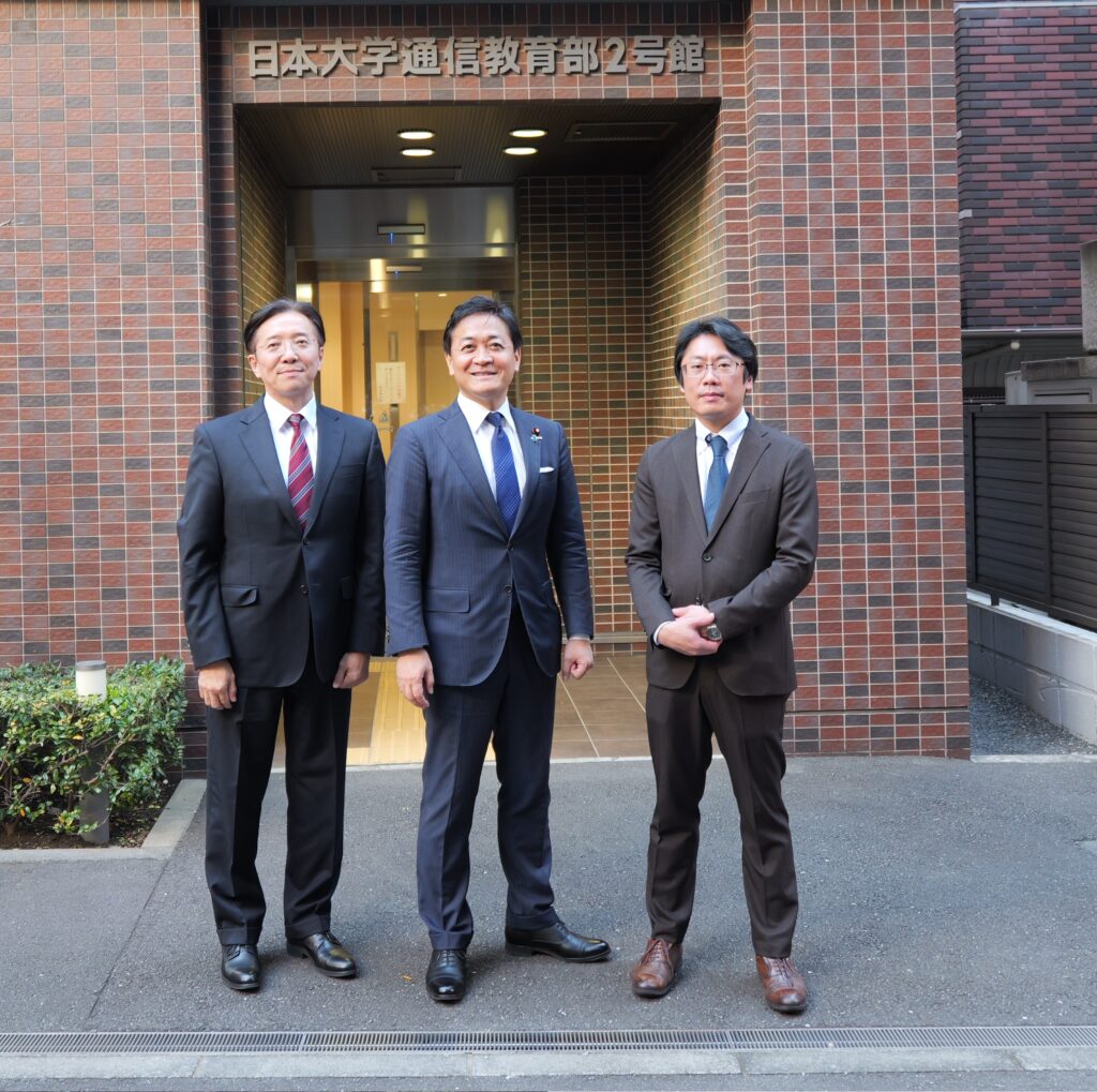 ・玉木代表と通信教育部教員(写真左から陸亦群(通信教育部長・教授),玉木雄一郎(国民民主党代表・衆議院議員),桶本秀和(通信教育部・助教))