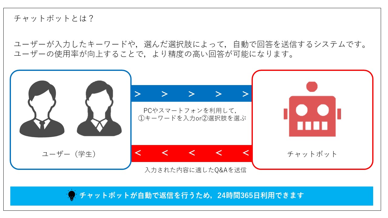 通信教育部に関する『在学生向け』のお問い合わせに24時間365日お答えできる「通信教育部チャットボット(テスト版)」を開設しました。