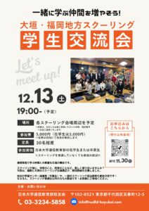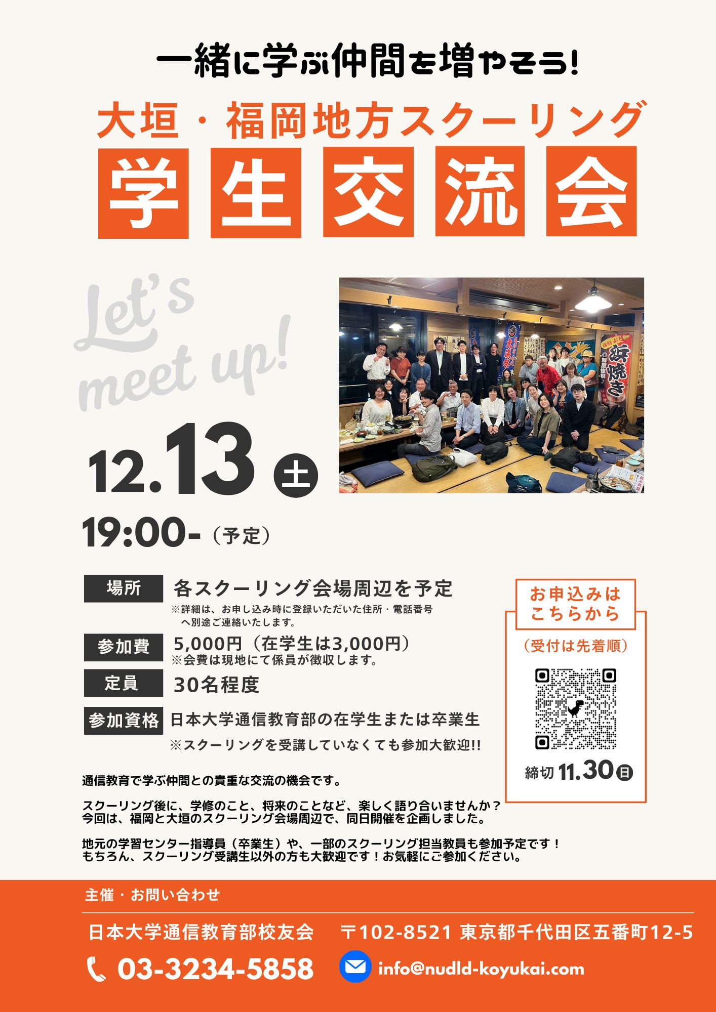 日本大学通信教育部校友会主催による,地方スクーリング【大垣・福岡】学生交流会が開催されます。